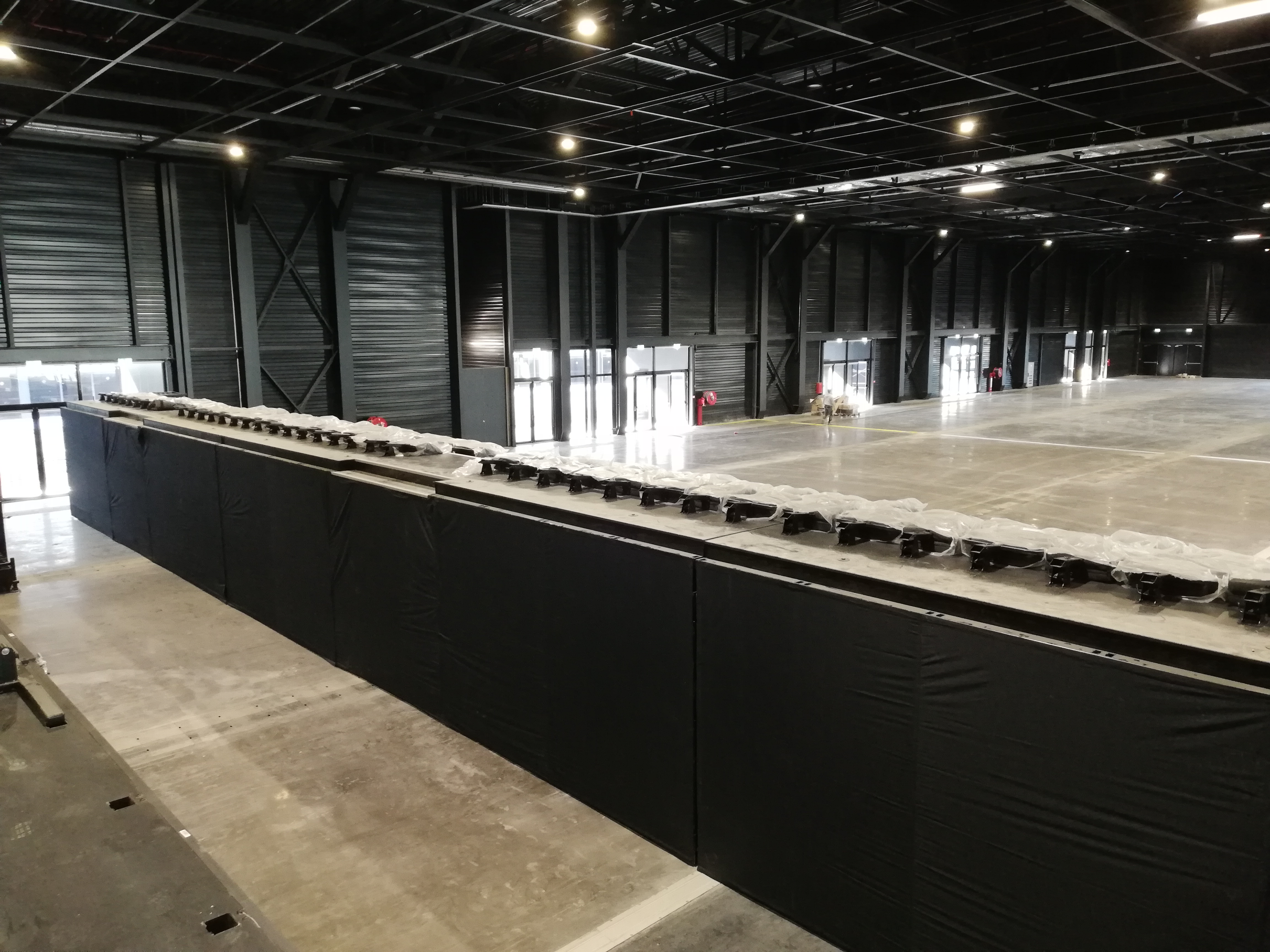 To make the stand easy to maneuver, it is equipped with omnidirectional wheels, designed to move efficiently on bumpy or uneven ground. The lower parts of the seating systems can be stored outside the hall, and are moved with the help of an electric trolley. The upper parts are stored against the back wall of the hall and are moved by remote control using the MASTER Eureka system.