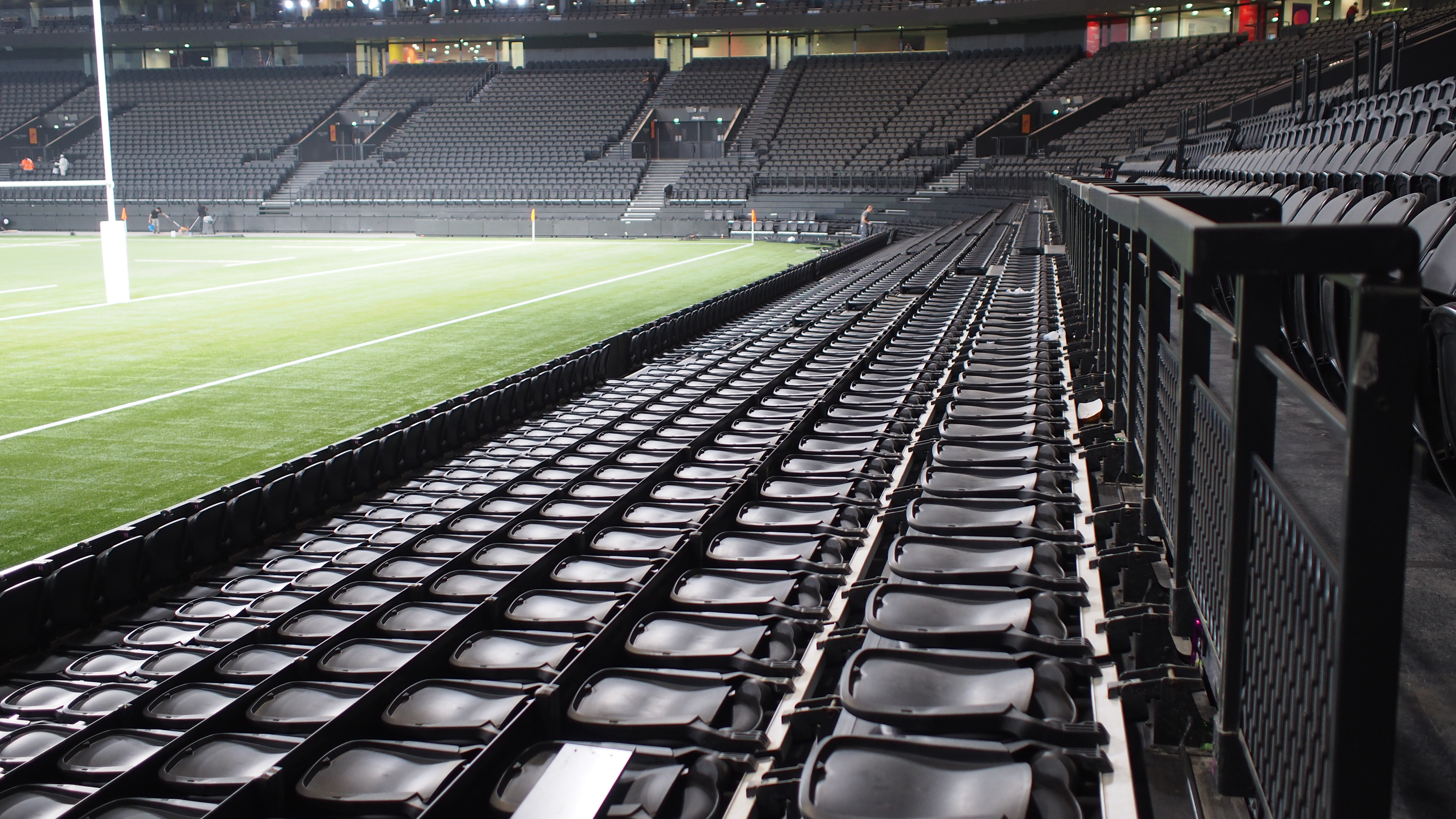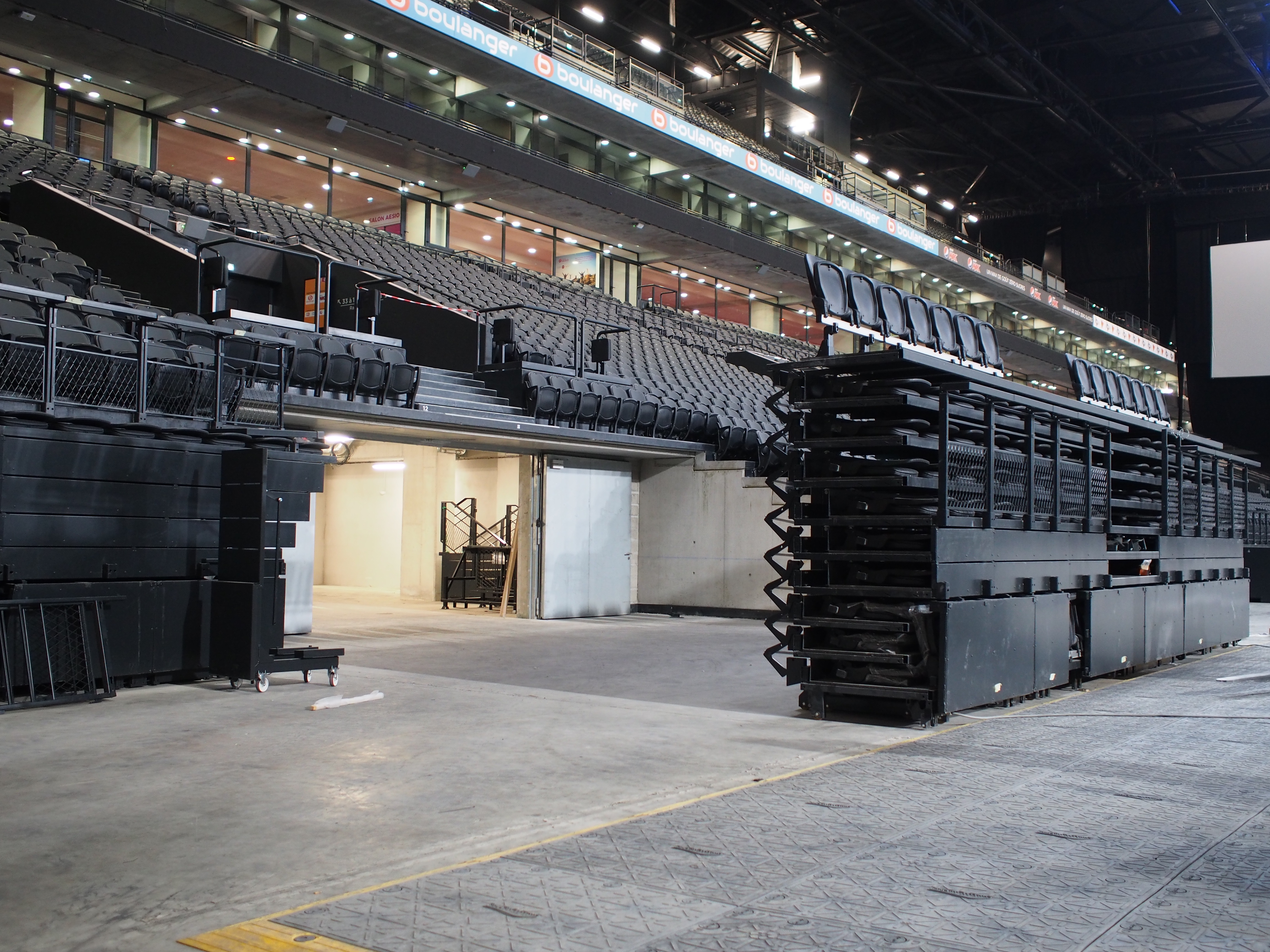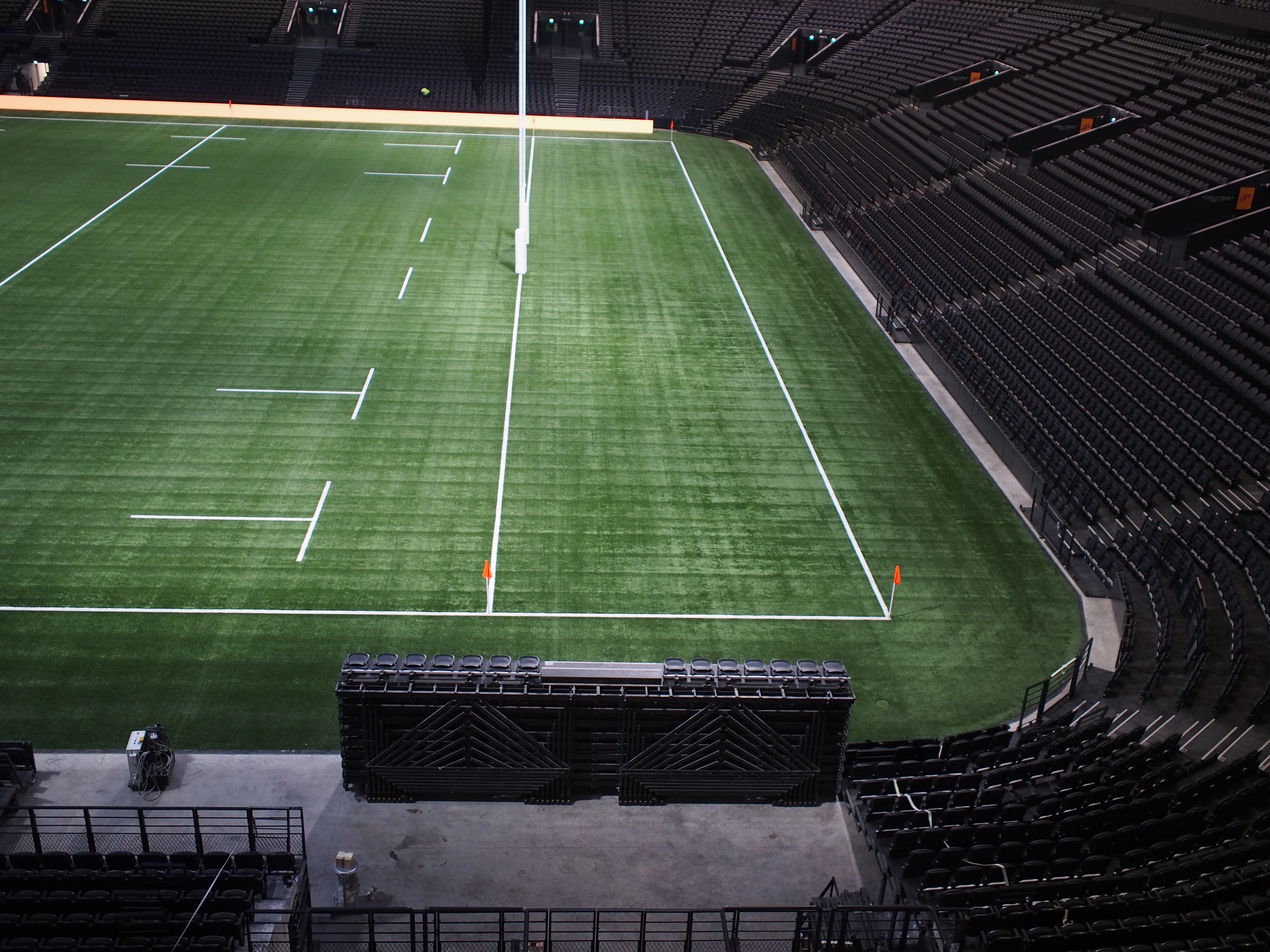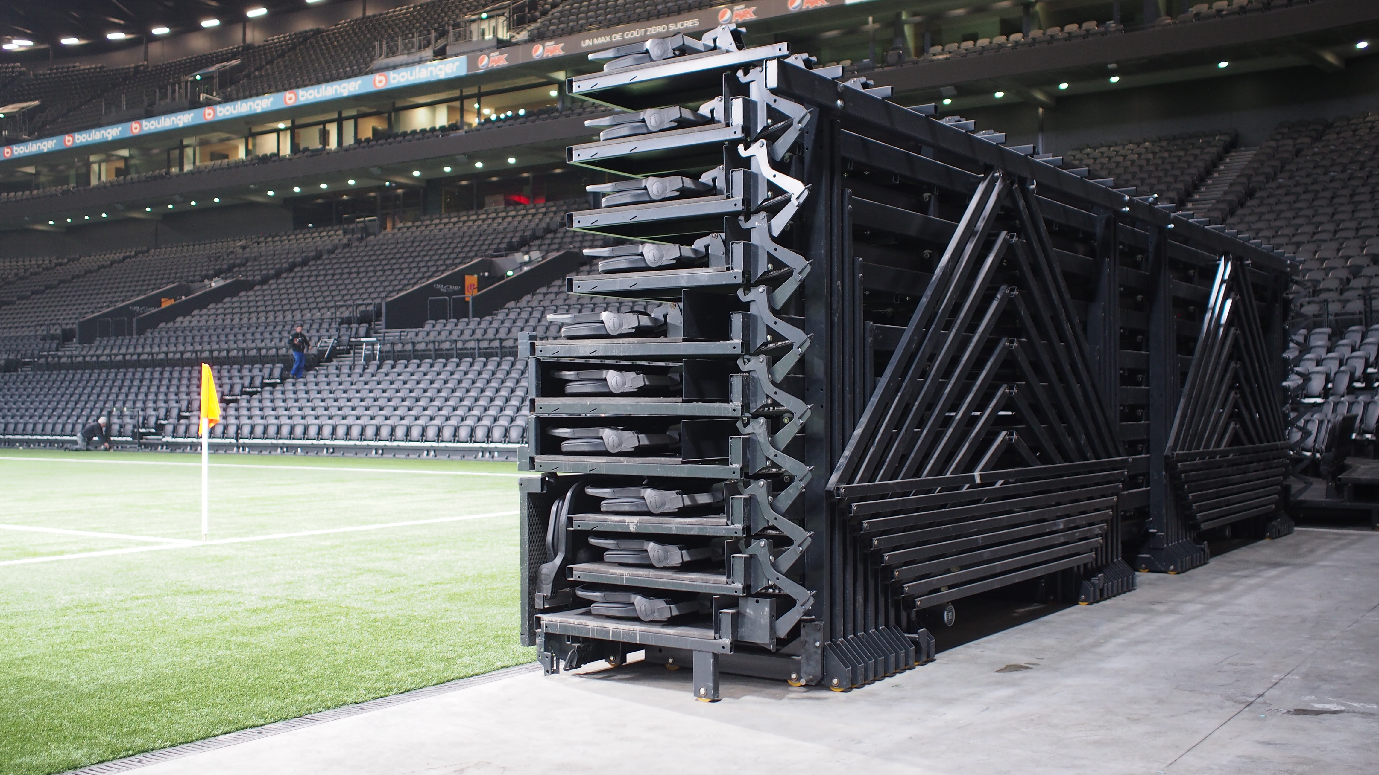 The stands themselves are completely modular and retractable to facilitate a wide range of configurations. They include some complicated corner stands which were custom made to open and close in the unusual space. For major sporting events the stands can be totally opened, for matches using a grass pitch they can be partially open and for concerts with standing only areas they can be closed. For events with smaller audiences, some stands can be open while others remain closed, using a dividing curtain to change the layout as required. When sections are not needed they can be removed to storage easily using a forklift and trolleys.